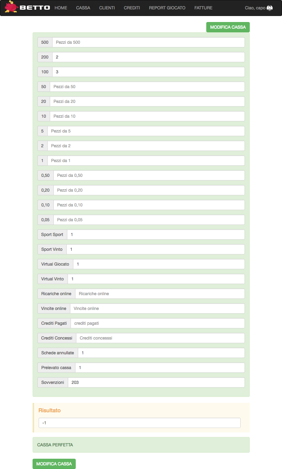 L’utente Gestore è l’unico che può effettuare la modifica della cassa.