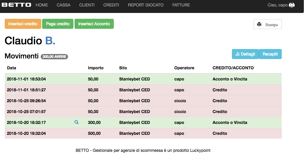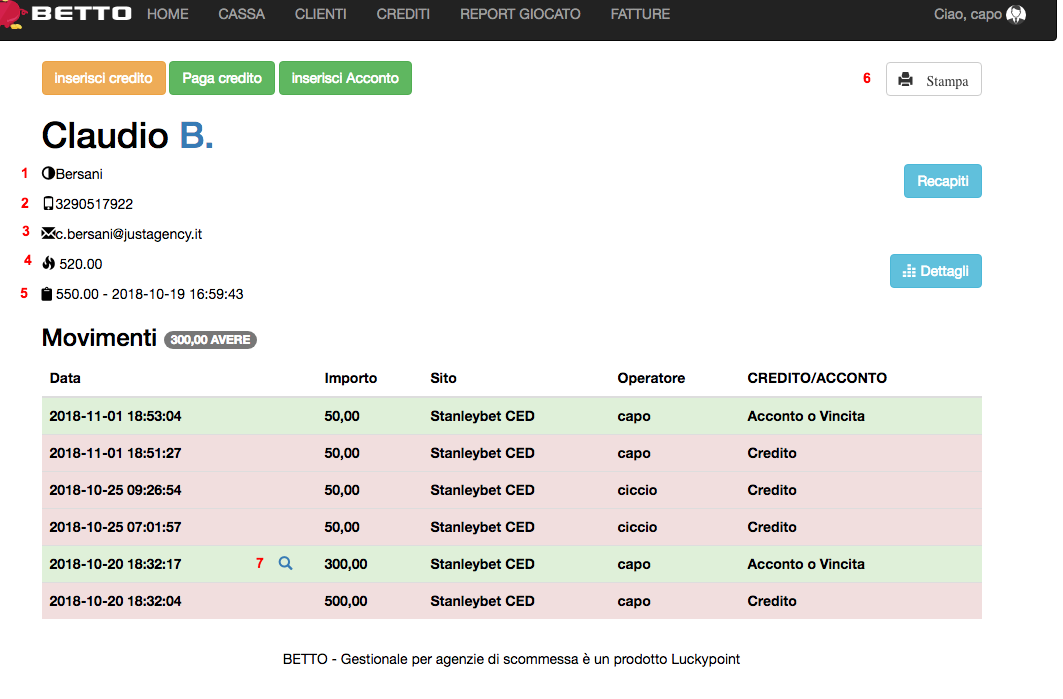 L’area dettaglio cliente mette a disposizione tutti i dettagli e movimenti del cliente.