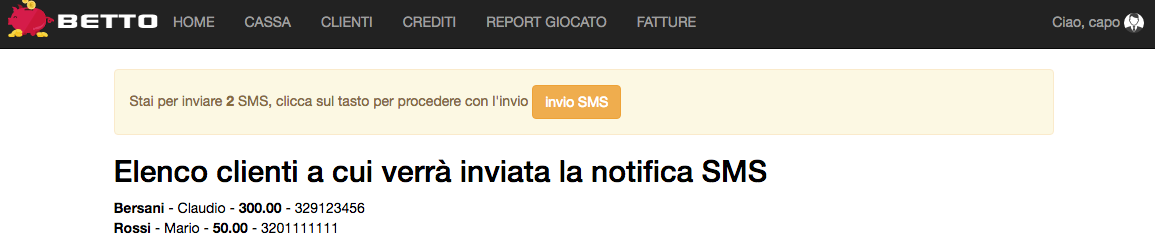 Prima dell’invio c’è una schermata riepilogativa con il totale degli SMS che verrà inviato, con l’elenco nominativo dei clienti con il relativo importo.