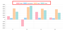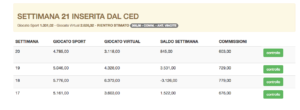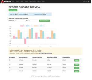 Questa sezione riporta indici e analisi puntuali su: Totale giocato sport, Totale giocato Virtual, Totale Commissioni e saldo inviato al provider il tutto sintetizzato in un grafico diviso in settimane.